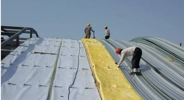 1、铺设离心玻璃棉毡需依次从屋脊向檐口防线铺设,棉毡铺设垂直于檩条 ,放卷时保证对齐和张紧,必须铺平无翘边,折叠,接缝严密,上下层铺缝,纵 向搭接时其搭接头应安在排檩条处。